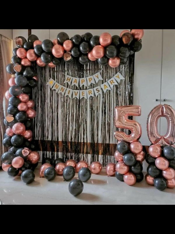 • One happy anniversary banner, black frills on wall, 50 the no. Foil balloons, arch of balloons 100-150 balloons, color- black and pink chrome