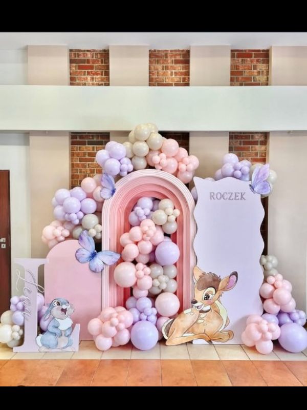 • One (3*2) pink customised sunboard , one unicorn fibre frame , one (6*3)Lavender naming sunboard , 5 cutouts , arch of 400-500 balloons , colour – pastel pink , beige , purple ,some macron balloons Cake table NOT INCLUDED