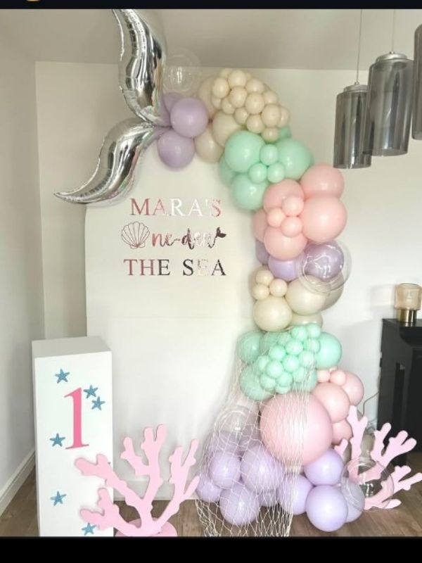 | one (6*4) customized sunboard,4 strawberry foil balloons, one red cutouts, arch of 350 balloons color- pastel pink, red and white, 2 red bladders, cake table NOT INCLUDED |