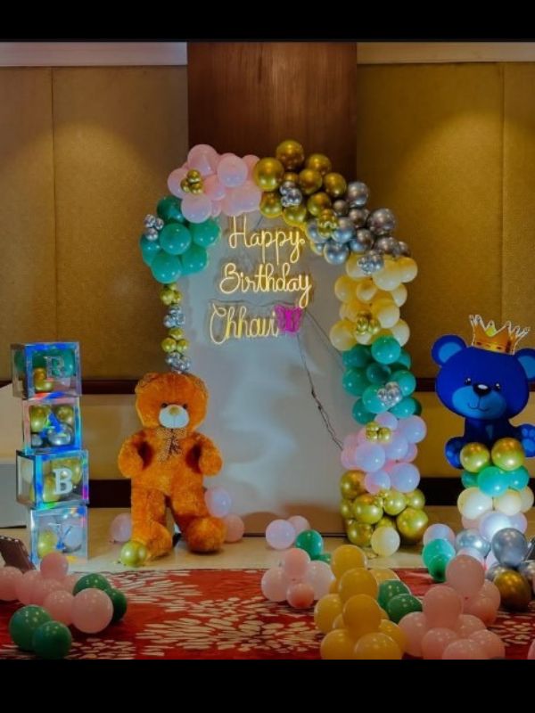 | one (6*4) sunboard ,Happy birthday neon sign, customize naming neon sign, arch of 300 balloons, color – olive green, pastel pink golden and silver chrome, one teddy bear, one teddy bear cutout, baby dice box, NO CAKE TABLE INCLUDED |
