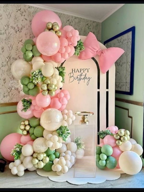 | ONE (6*4) customized rainbow sun board, one floor flex, one pink bow, arch of 200 to 300 balloon color- beige, olive green, pastel pink, some green leaves bunches, three pink macron balloon, three beigy macron balloon, CAKE TABLE NOT INCLUDED |