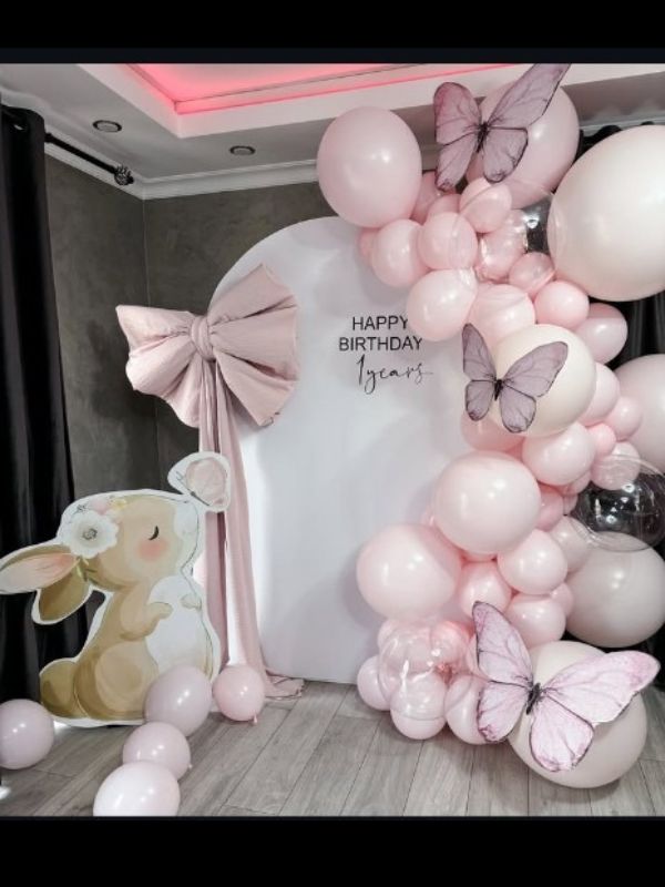 • One (6*4) customised sunboard One customised bow Arch of 150-200 balloons , colours – pink pastels , pink macron , bladder and 3 bubble balloon. 3 butterfly cutout , one cute bunny cutout