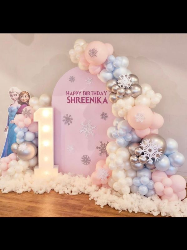 | One (5*3) customised sunbaord , one no. Marque letter ,one elsa aana cutout , some snow flakes cutout , arch of 400-450 balloons , colour – pastel pink , , blue , beige , golden chrome balloons , cotton flooring on the setup ,Cake table NOT INCLUDED |