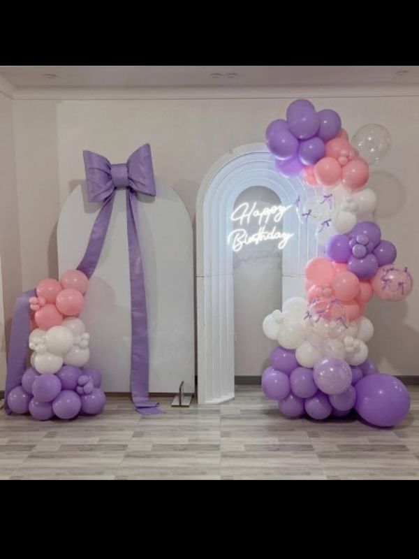 one (5*4) customized sun board cutout with bow ,one fiber frame (6*4) happy birthday neon sign, arch of 250 to 300 balloons color- pastel pink, purple and white, five macron balloon- pink and purple, four bubble balloons