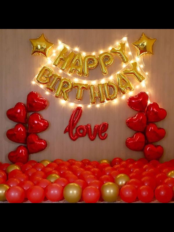 • One happy birthday foil balloon, foil balloons- star, and heart shape, love, fairy lights, 100-150 balloons, colour- red and golden chrome,