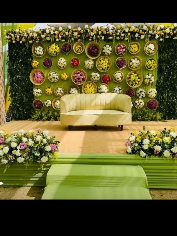 • Backdrop green 15*10, 2 sides greenry bed, multiple tokri with flower , platform 15*12, couch , garden flower.