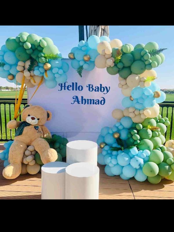 | 7*7 hello baby theme flex customige arch of 400 to 500 beigy,sky blue,olive greeen ,golden chrome,one teddy(returnable) some green one cake table |