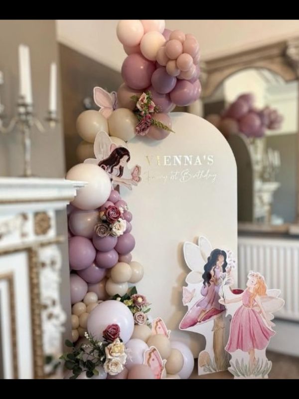 | one (6*4) customized sun board three fairy cutout, two butterfly cutout, some flower bunches, arch of 150 to 200 balloon color-pastel beige, purple, white two macron balloons lavender and white |