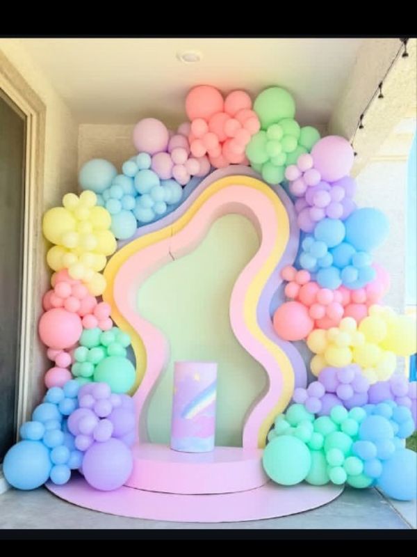 | one wavy rainbow fiber frame, one cake table, one floor flex, arch of 400 balloons, color- pastel pink, sea green, blue, purple, pink, yellow |