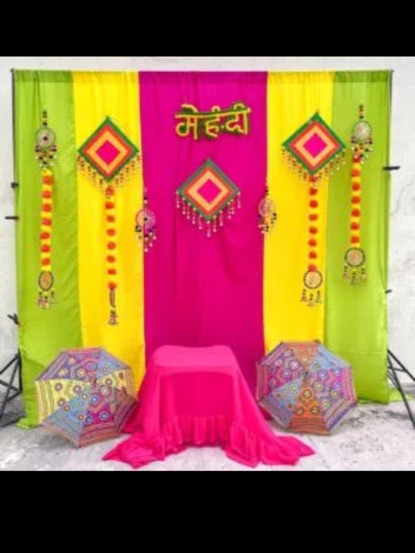• backdrop colorful, mehndi tag, kites and hangings, 1stool, 2umbrella