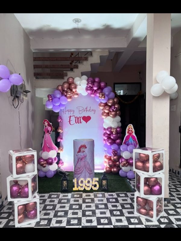 | one (6*4) customise happy birthday , sun board , 2 princess cutout (2*2) 2 lanturms trash,6 dise balloon boxes,4 small morque latter, arch of 200 ballon clour -pastel purple, chrome rose , gold ,white and pink chrome ,one cake tabble |