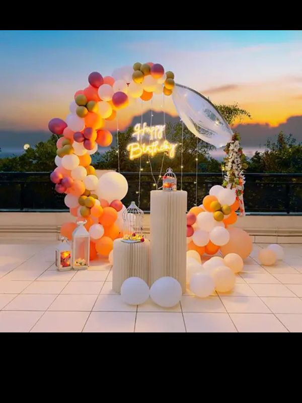 • One 6×6 ring frame, 1 neon sign happy birthday, fairy lights, bunches of flowers, arch of 300 to 350 colour- white, baby pink, orange, golden chrome, cloth draping Cake table not included Props not included