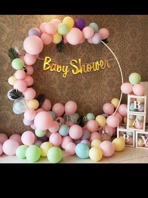 • 6×6 ring frame, one baby shower banner, 5 piece confetti balloons,artificial leaves, 1 baby dice box , arch of 200-250 balloons, colour-pink, blue, yellow and white, sea green