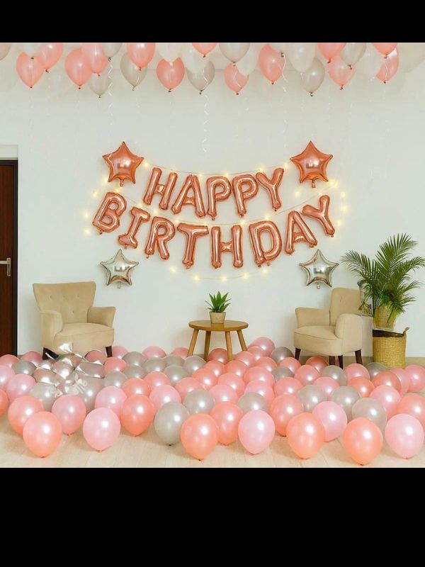 | One happy birthday foil balloon, 4 star foil balloon colour- golden , and silver, arch of 100 to 150 balloons colour- pink and silver on floor and roof , one fairy light . |