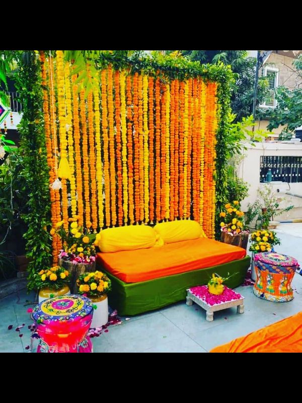 • backdrop with marigold hangings, Greenery runner 3 edge.